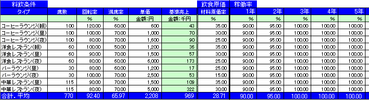 ・飲食タイプごとに、席数、回転率、満席率、単価、材料原価、稼動率の設定が可能です。