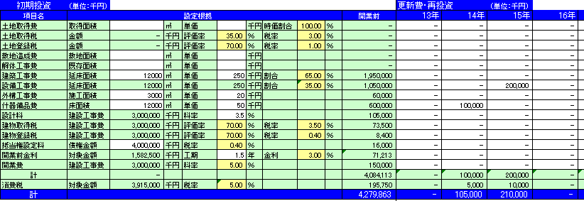 ・初期投資は、土地取得、解体・新築工事、公租公課等の金額、根拠を設定します。